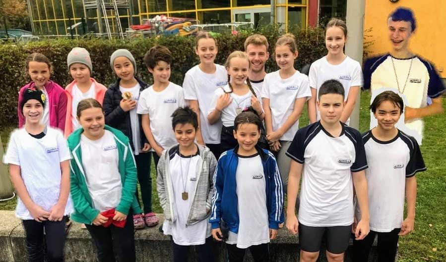 Das Nachwuchsteam des SC Aqua Köln 2008 e.V. beim Herbstschwimmfest in Bergheim (v.l.n.r.): Anna L., Ilvia, Anna W., Khaled, Margit, Fanny, Eike (Trainer), Paula, Nike, Leander (obere Reihe). Maryam, Cajsa, Noyan, Björn, Sven, Janis (untere Reihe).